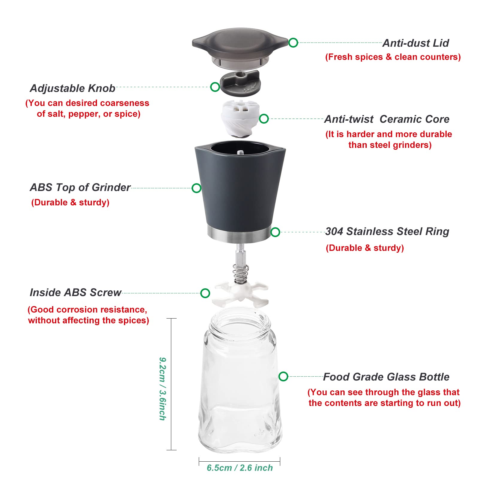 Adjustable Ceramic Core: The professional pepper grinder contains an efficient adjustable anti-twist ceramic grinding core, which can effectively avoid the core loss and the mixing of ceramic powders.